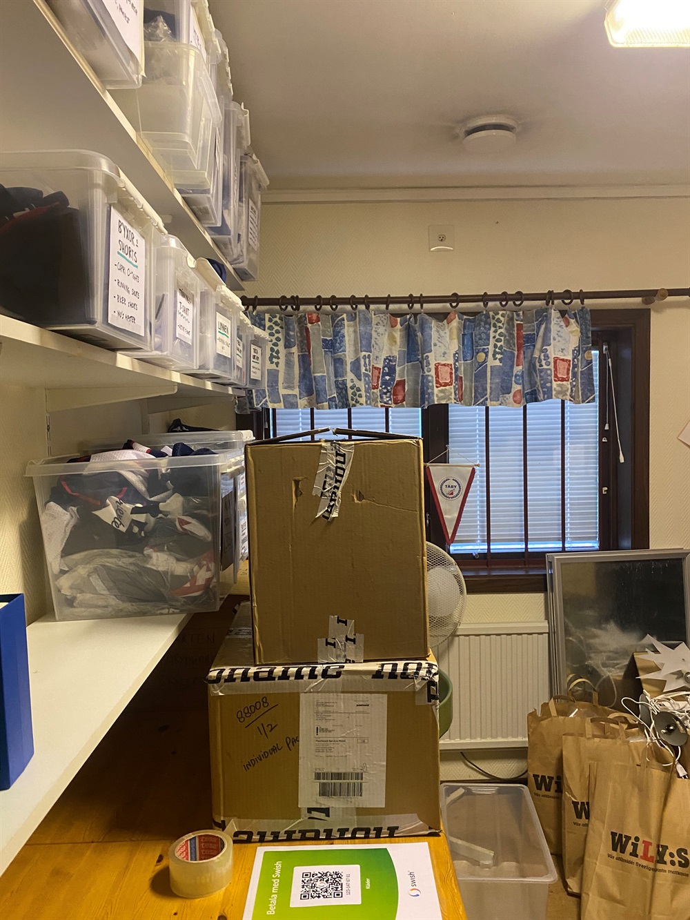 Nu är beställningarna av klubbkläder redo att hämtas i klädförrådet i Skavlöten. Alla ordrar är packade efter namn. Flera av ordrarna har hamnat i två paket, jag har försökt sätta ihop paketen så gått jag kunde...